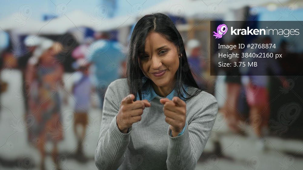 Latin woman smiling at outdoor market with people in colorful attire, gesturing happily in a lively street setting, showcasing vibrant community atmosphere. - Kraken Images