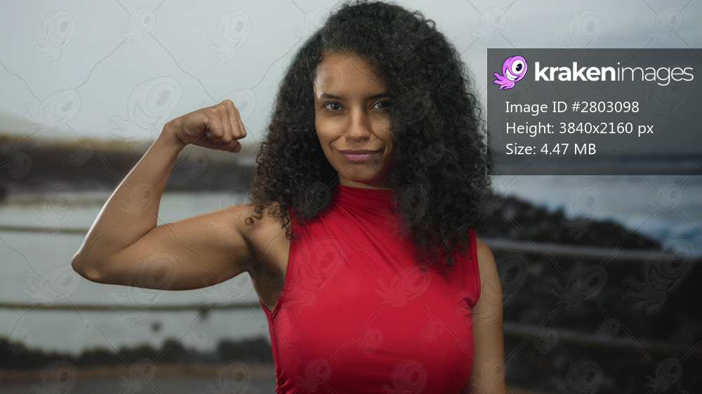 Latin woman wearing a red sleeveless top flexes her bicep at a sunny sandy shoreline beach; empowerment.