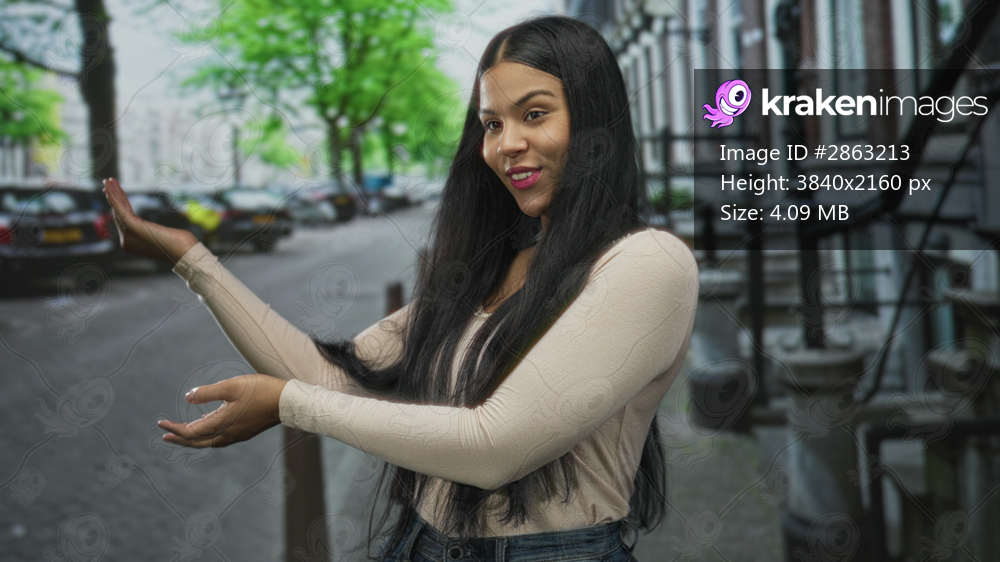 Latin young woman gestures arms with open palms amid sunny urban tree lined street by parked cars; warmth invitation friendliness openness.