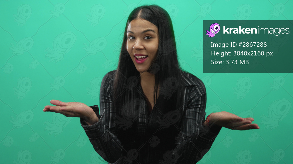 Latin young woman sits casually smiling, winks and shrugs with open palms in green studio; playfulness joy.