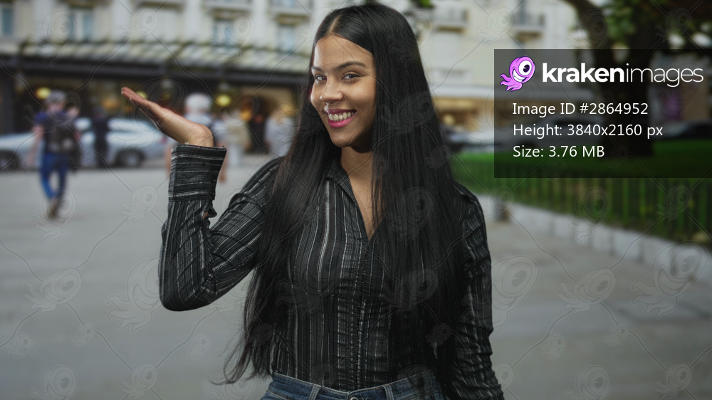Latin young woman smiling holds palm up on bustling city street lined with historic buildings; optimism.