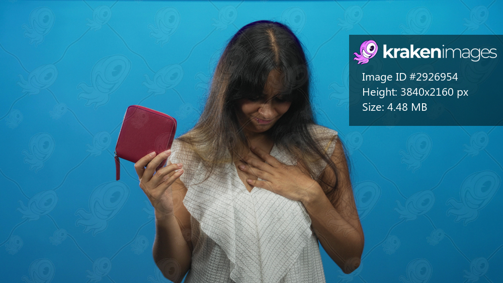 Latina brunette woman holding small red wallet, hand on chest, expressive face in blue studio; gratitude.