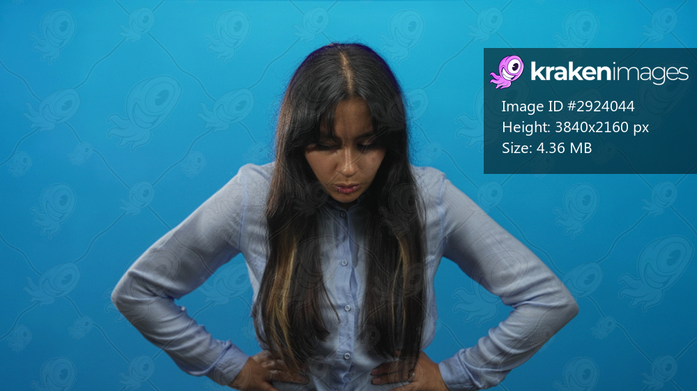 Latina woman with hand on stomach and pained expression in blue studio; discomfort nausea queasiness.