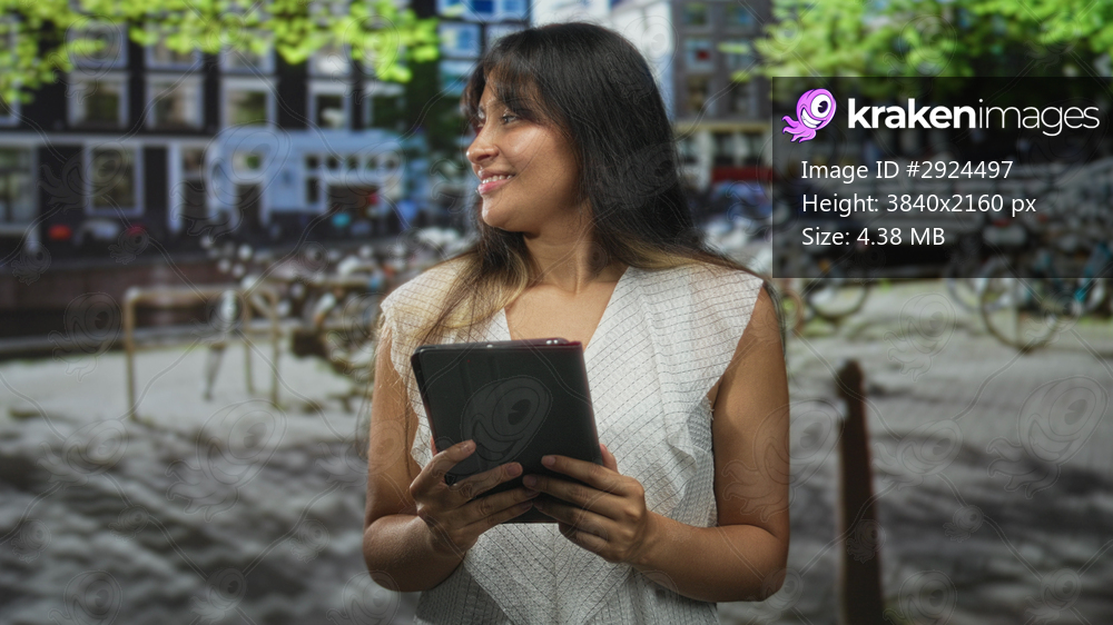 Latina woman holding tablet with hands visible on street by canal and bicycles; serenity exploration.