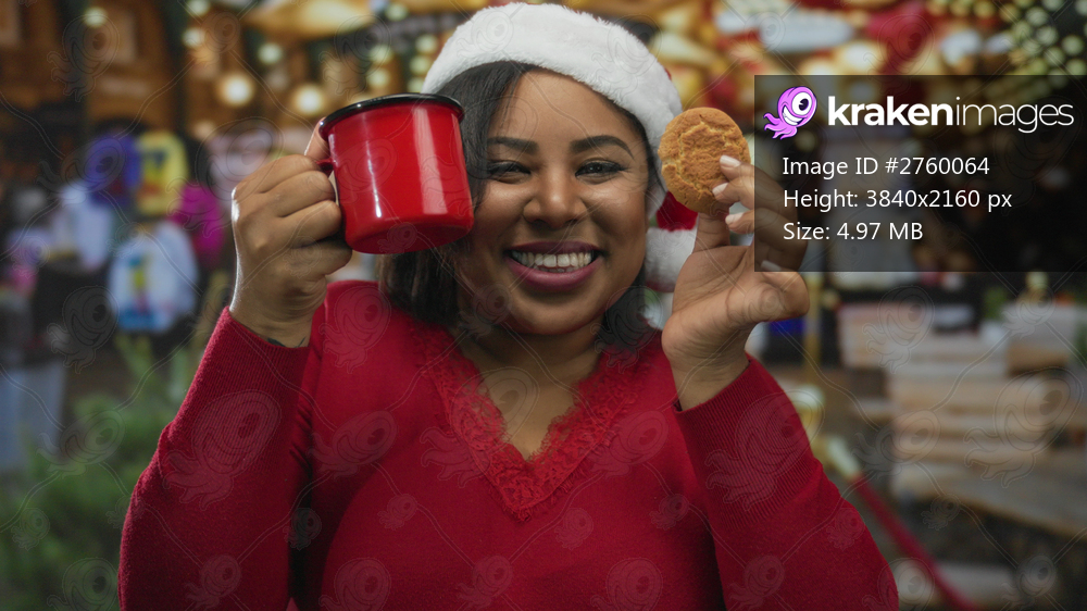 Latina woman in festive red outfit enjoying coffee and cookie outdoors in a city market, surrounded by vibrant lights and holiday cheer, wearing a santa hat with a warm smile. - Kraken Images