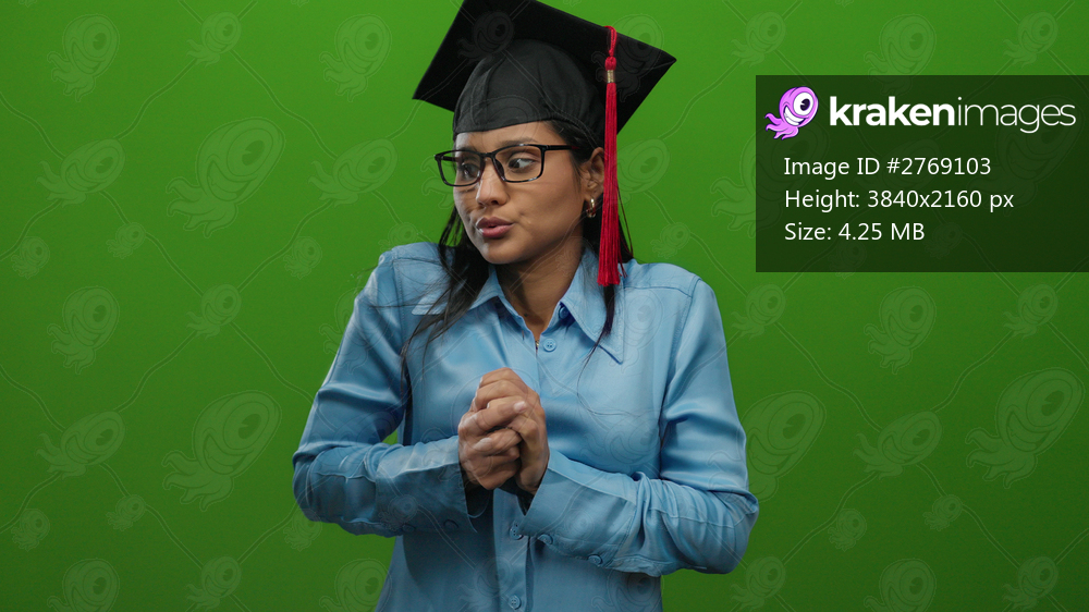 Latina woman in graduation cap expresses excitement against green backdrop, highlighting academic achievement and diverse cultural representation.