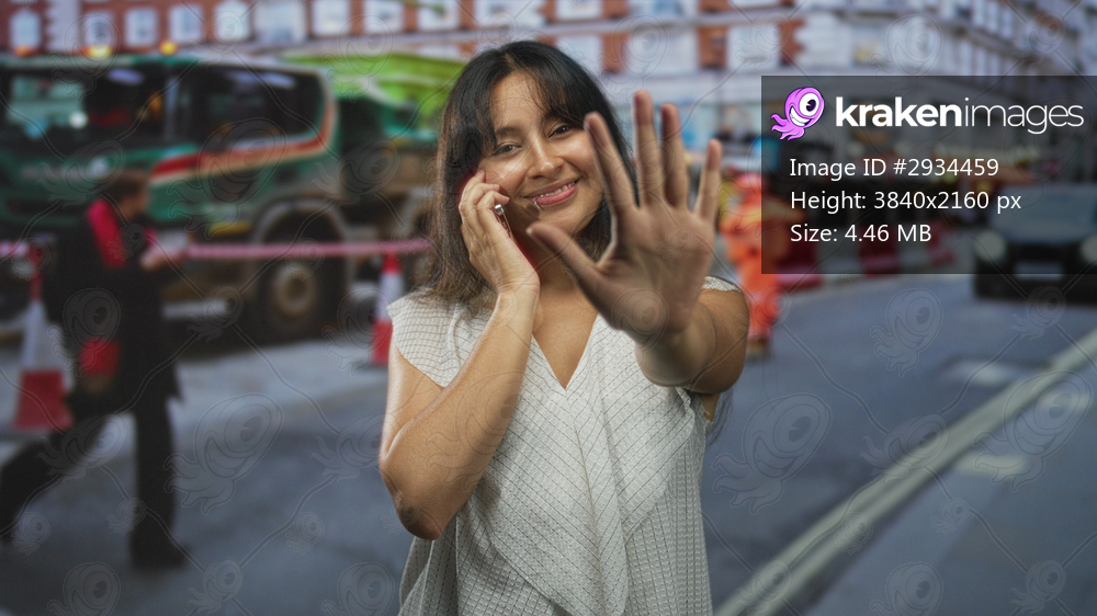 Latina woman points finger while talking on phone on a busy street construction site with cones and workers nearby; confidence resilience.