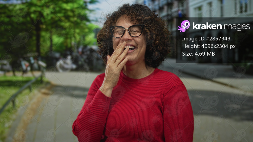 Latina woman wearing glasses and a red sweater laughs while covering her face with her hand on a city street; amusement.