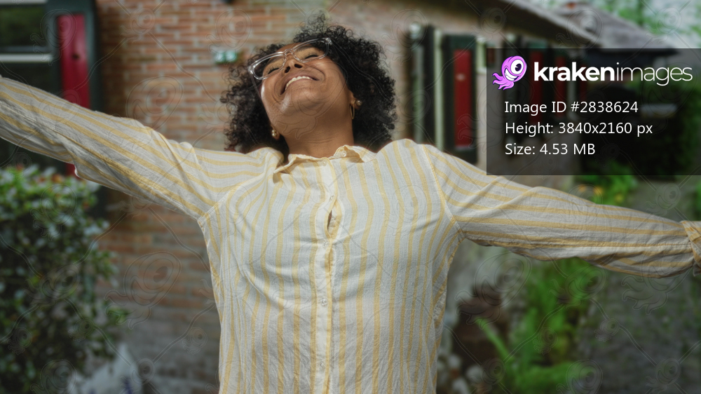 Laughing woman wearing yellow striped shirt spreads arms outside sunlit building entrance; pure joy.