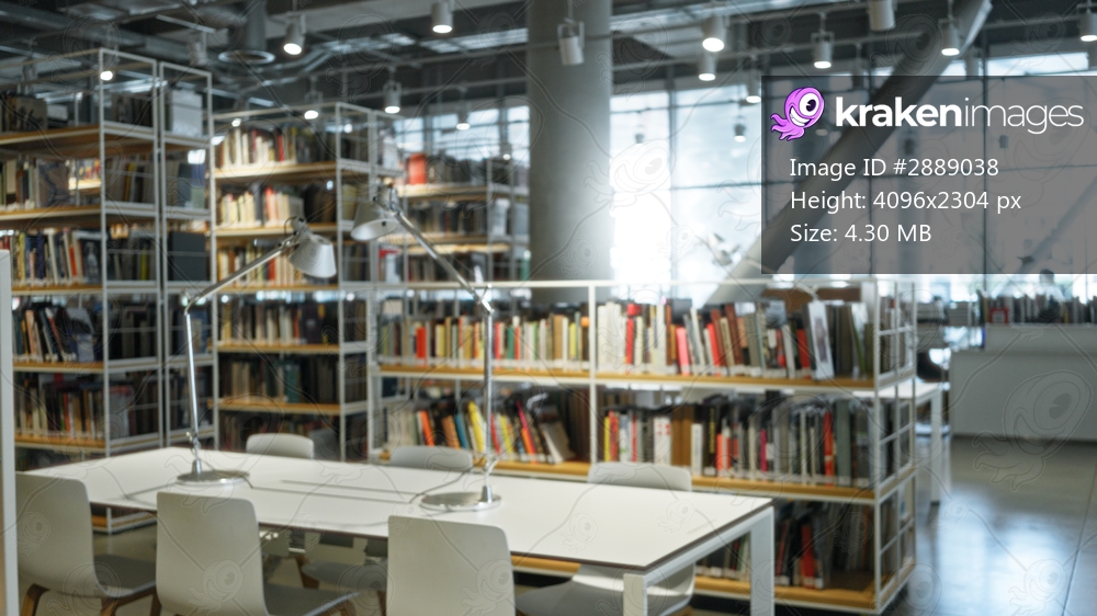 Library reading area with shelves, study table and desk lamps softly defocused interior; background backdrop copyspace calm.