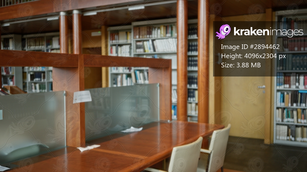 Library reading desks and book stacks softly defocused interior with shallow bokeh and warm wood tones; background backdrop copyspace calm.