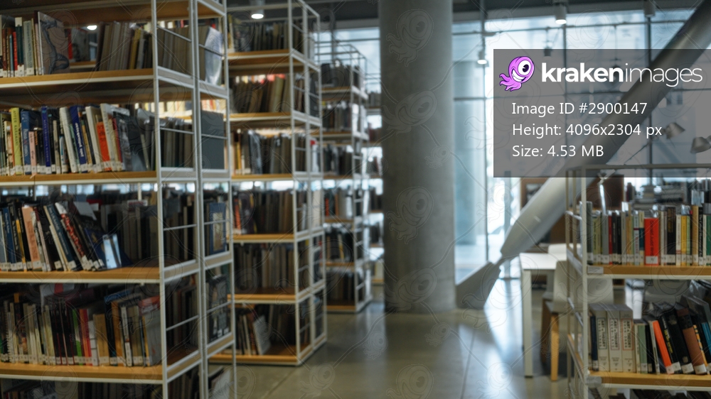 Library stacks shown with shallow defocused bokeh and soft focus on shelving interior; background copyspace backplate calm.