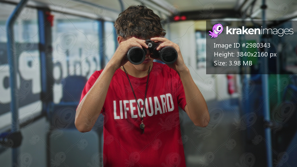 Lifeguard man adjusting binoculars with hands inside a public building interior, wearing red lifeguard shirt and whistle; duty vigilance.
