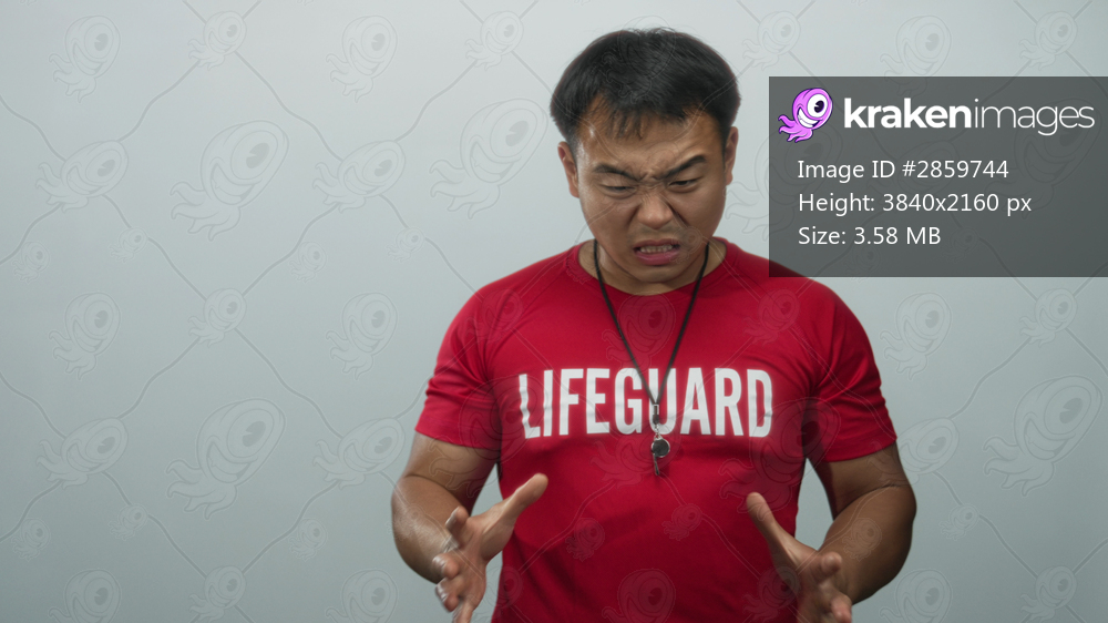 Lifeguard man clutch chest in pale grey studio wearing red shirt and whistle on strap while grimacing from sudden chest pain; distress.