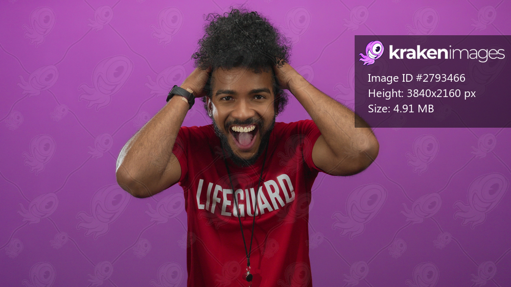 Lifeguard man with curly hair wearing red shirt expresses happiness against isolated pink background, embodying joyful emotion and vibrant youthful energy. - Kraken Images