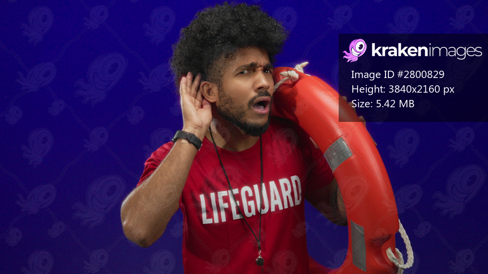 Lifeguard man gestures listening with hand on ear, holding rescue float against blue wall, creating a focused and attentive scene.