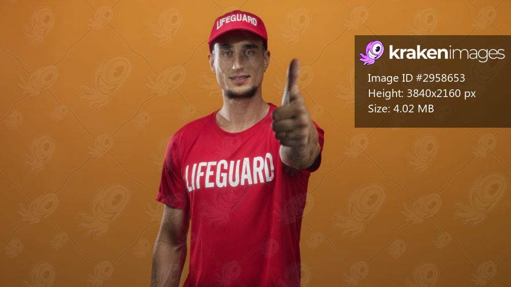 Lifeguard man gives thumbs up with visible thumb, red lifeguard shirt and cap with printed lifeguard lettering against orange studio backdrop; confidence duty. - Kraken Images