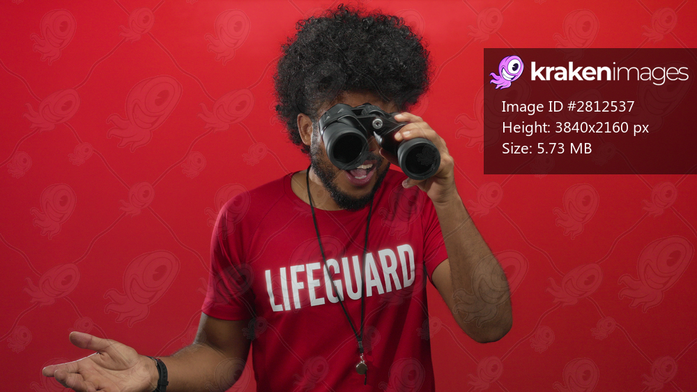 Lifeguard man holding binoculars with an expressive face in front of a red wall background, symbolizing alertness and focus in an isolated environment. - Kraken Images