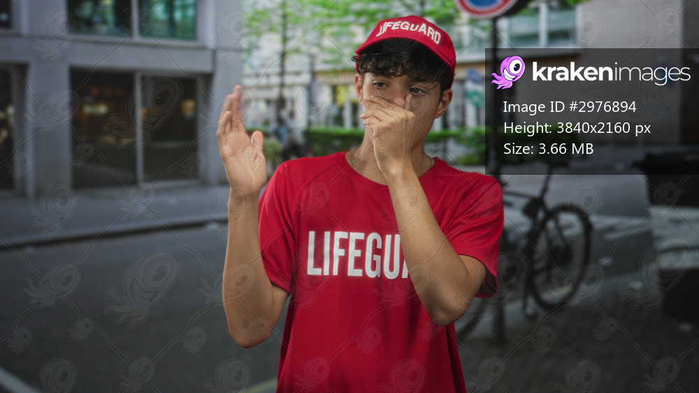 Lifeguard man holding hand to mouth on street beside bicycle rack and storefront, wearing red lifeguard shirt and cap; nausea.