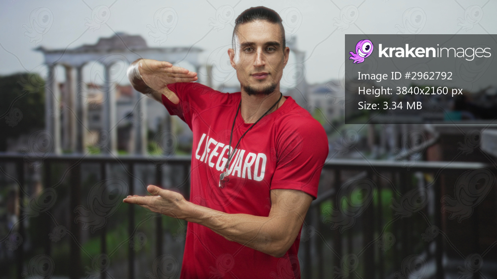 Lifeguard man in red shirt frames empty space with hands, showing forearm and whistle on chest on building balcony with ruins beyond; vigilance.