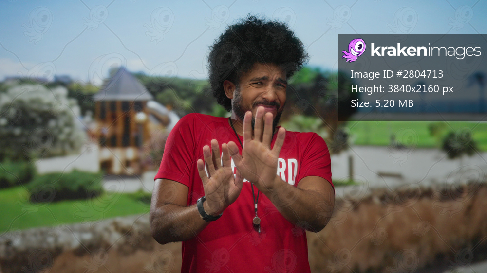 Lifeguard man in red shirt with gesture of rejection in outdoor park setting with greenery and blurred amusement park background