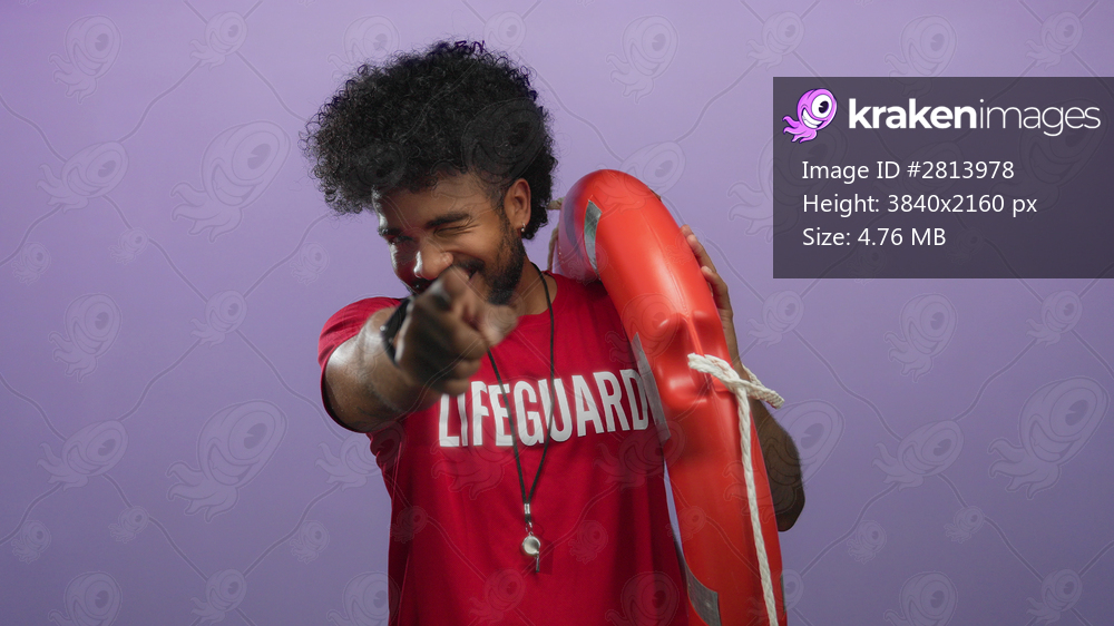 Lifeguard man in red shirt holding a rescue buoy, pointing and standing against a vibrant purple wall, showcasing a playful and confident demeanor.
