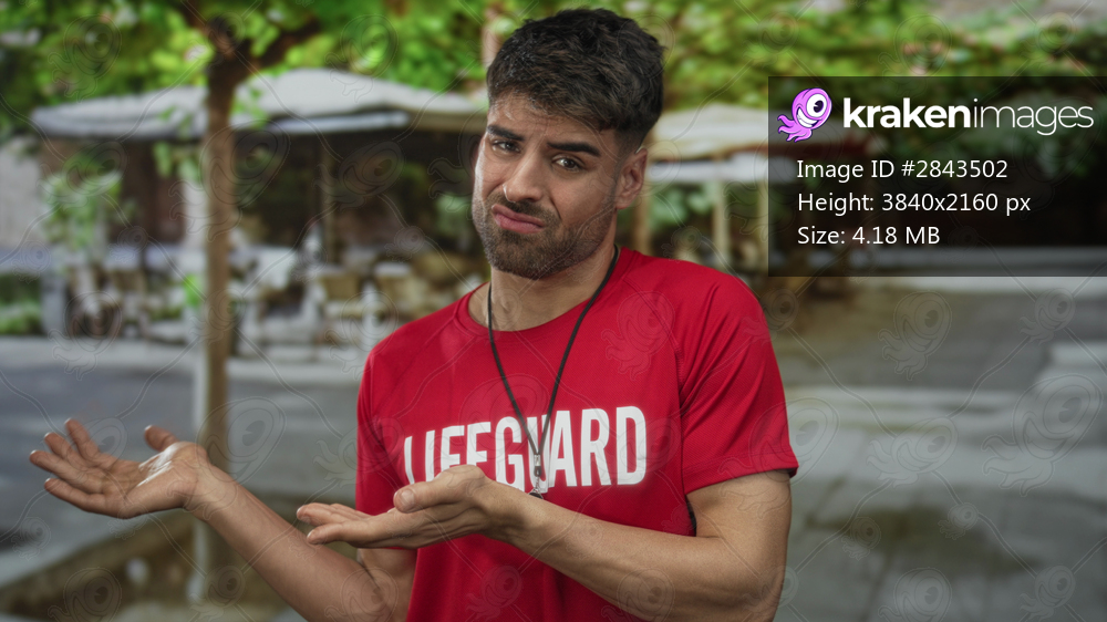 Lifeguard man in red shirt shrugs with both palms up gesture on restaurant terrace building; confusion.