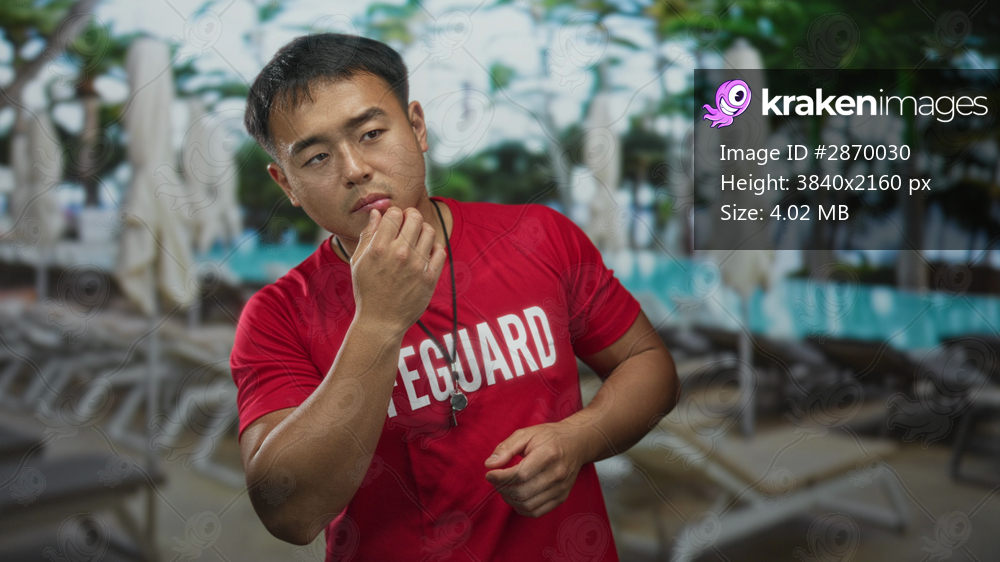 Lifeguard man in red shirt touches chin at sunlit outdoor pool resort beside lounge chairs; concern.