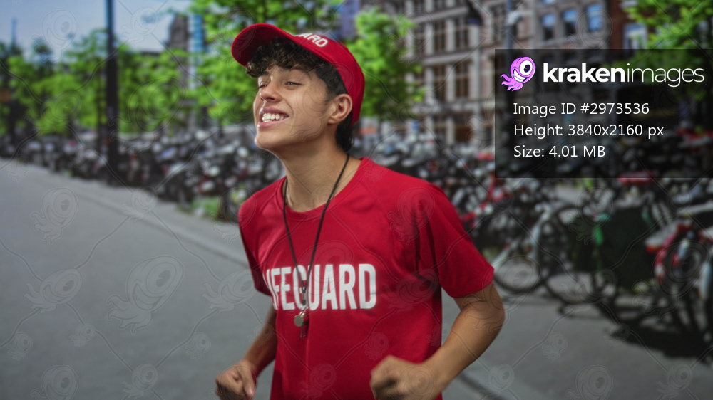 Lifeguard man in red t shirt and cap raises fists and holds whistle on a busy city street lined with bicycles and buildings; joy.