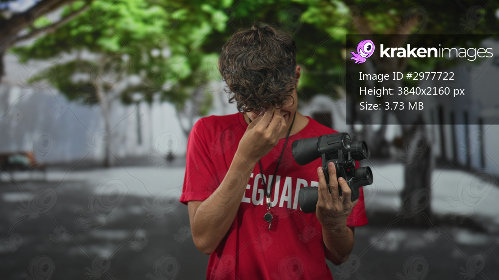 Lifeguard man pinches nose and holds binoculars and whistle while standing under trees on street; duty fatigue.