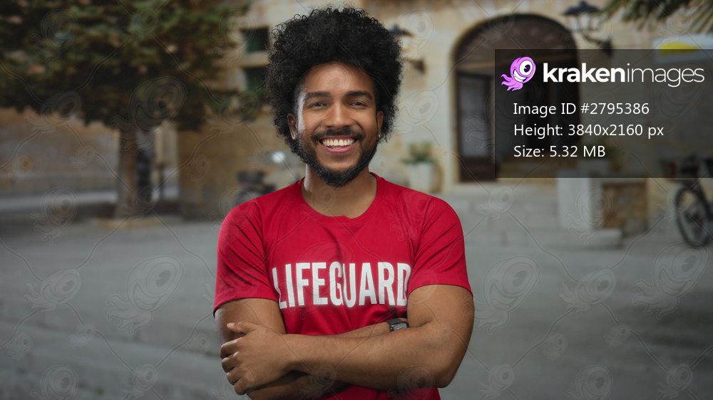 Lifeguard man smiling confidently with arms crossed on a sunny city street, wearing a red lifeguard shirt, surrounded by urban architecture.