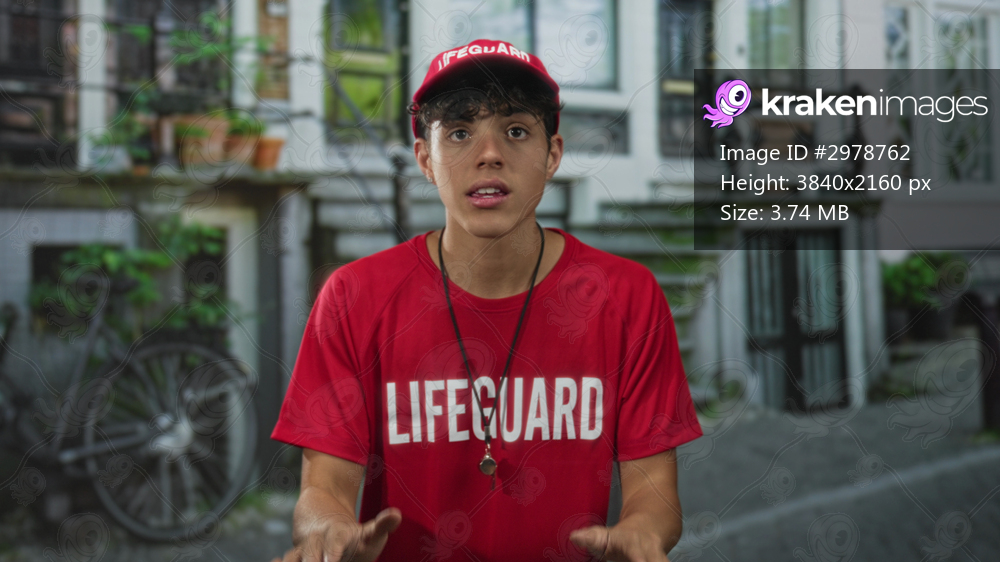 Lifeguard man teen in red lifeguard shirt and cap with whistle, hands forward palms out gesturing on street near bicycle and steps; alert duty.