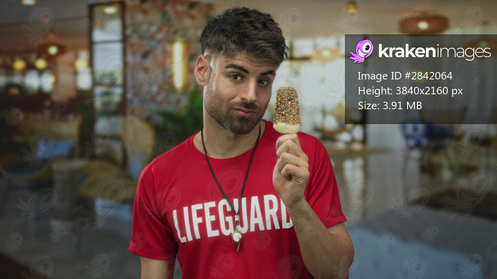 Lifeguard man wearing red shirt holds icecream popsicle bar with hand in hotel building; summer delight.