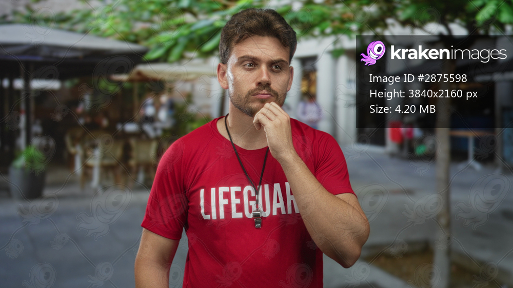 Lifeguard man with whistle and hand on chin standing on street near cafe and trees; thoughtful vigilance duty.