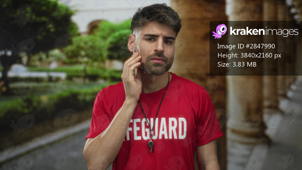 Lifeguard man with whistle and red shirt touches cheek beside green park path by stone colonnade in building; discomfort.