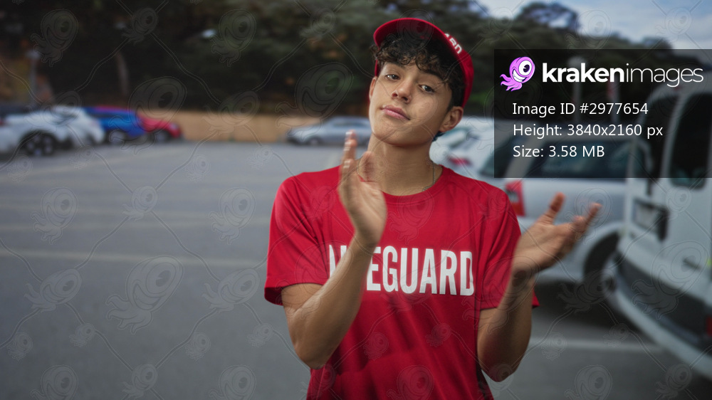 Lifeguard teen clapping hands in red shirt and cap on street parking lot with cars and trees; confidence duty.