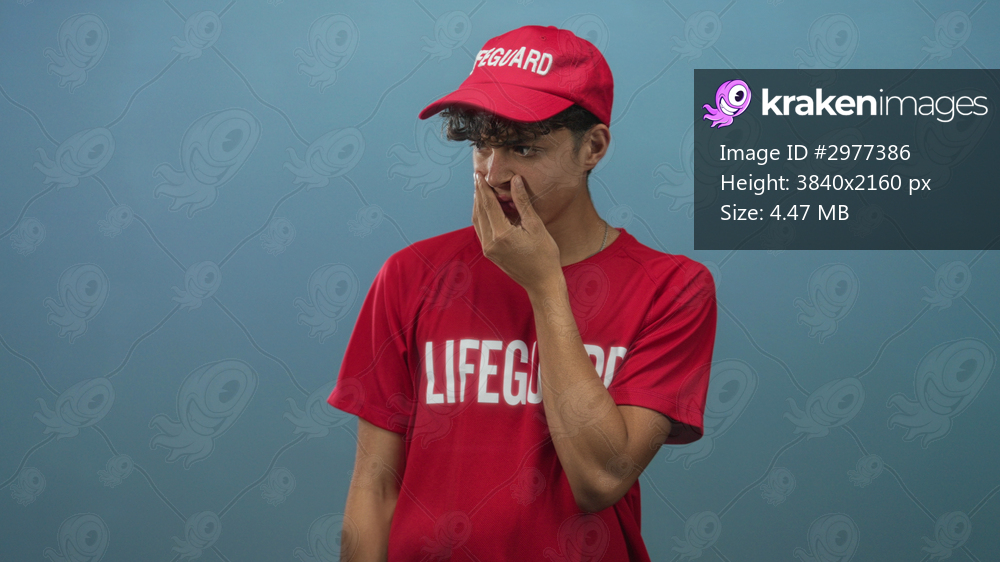 Lifeguard teen covers nose with hand and waves with other hand in studio against blue wall; shyness youth.