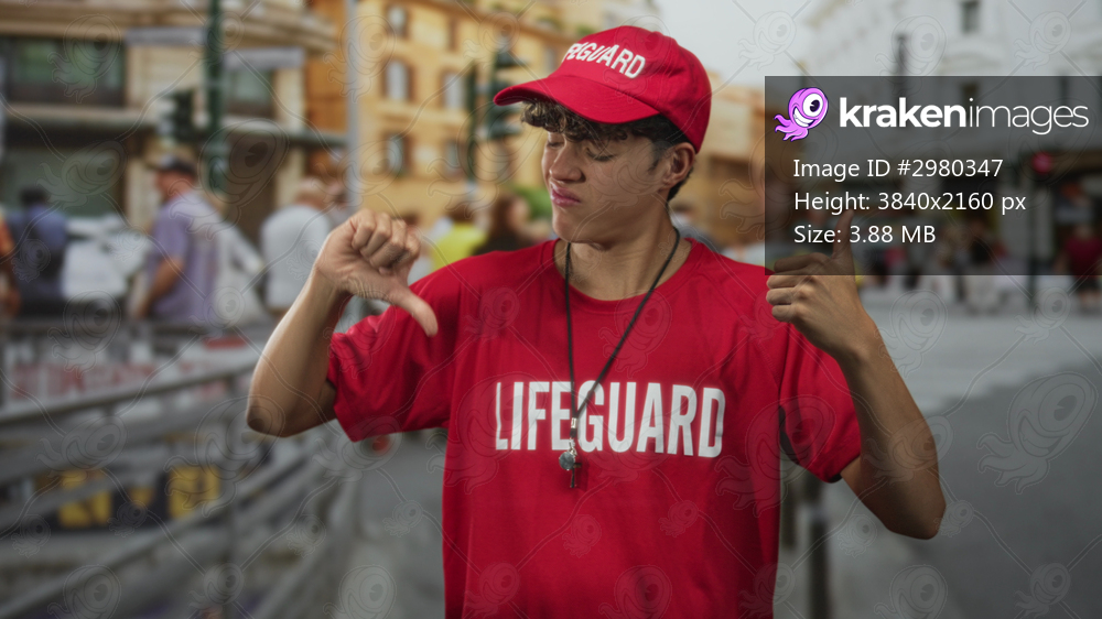 Lifeguard teen in red cap and shirt wearing whistle shows left thumb down and right thumb up on a city street; playful ambivalence.