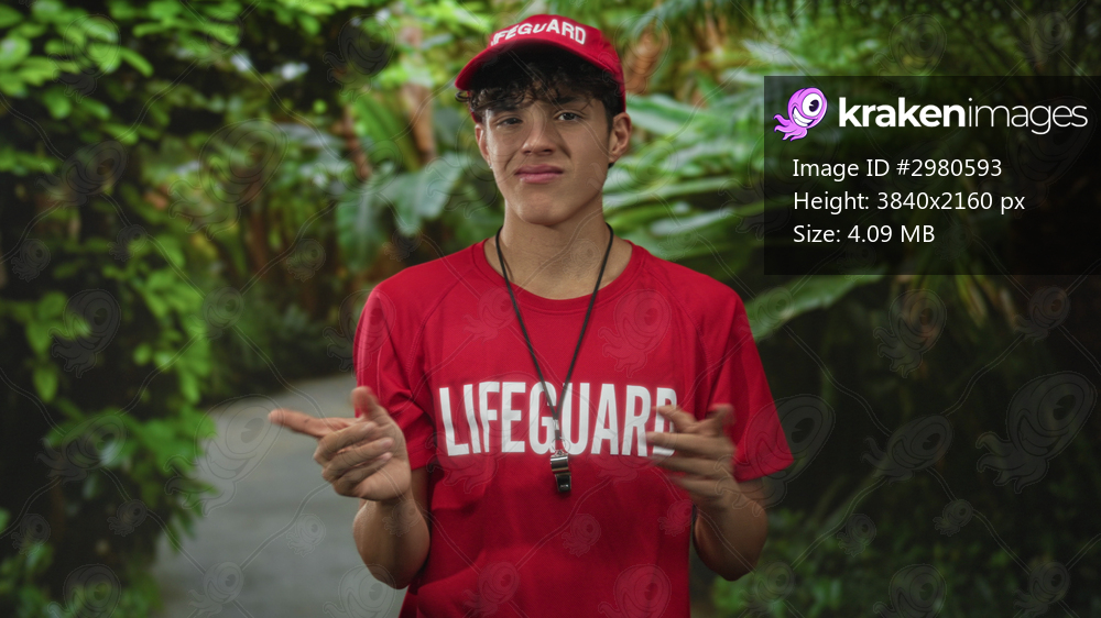 Lifeguard teenage boy touches chin, wearing red lifeguard shirt and cap, standing in lush forest path; quiet contemplation.