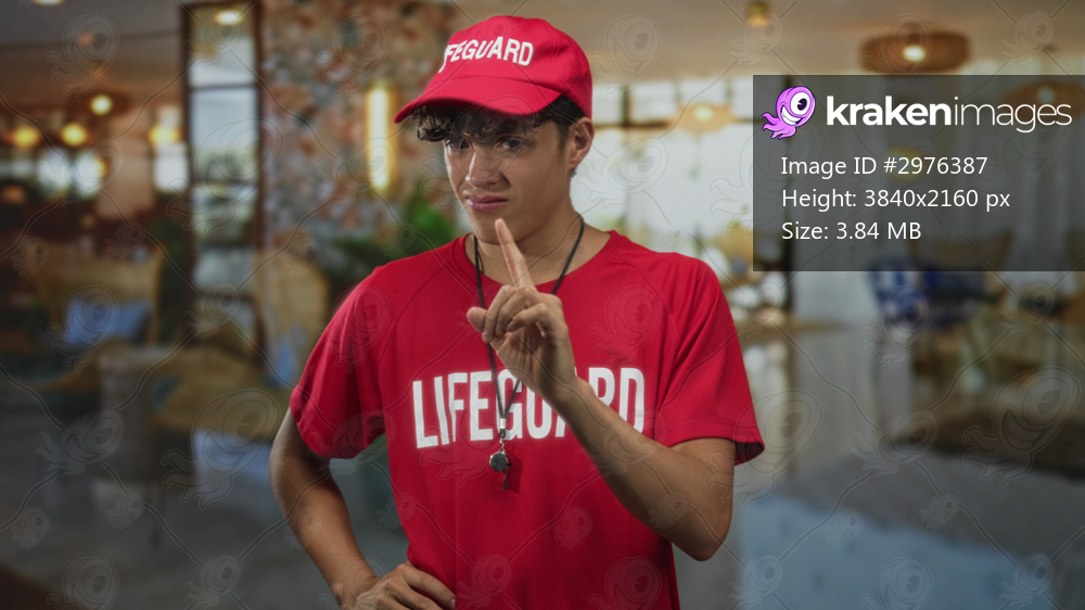 Lifeguard teenage man points index finger with bare hand, whistle on lanyard, red shirt and cap, serious expression in building lobby; duty caution.