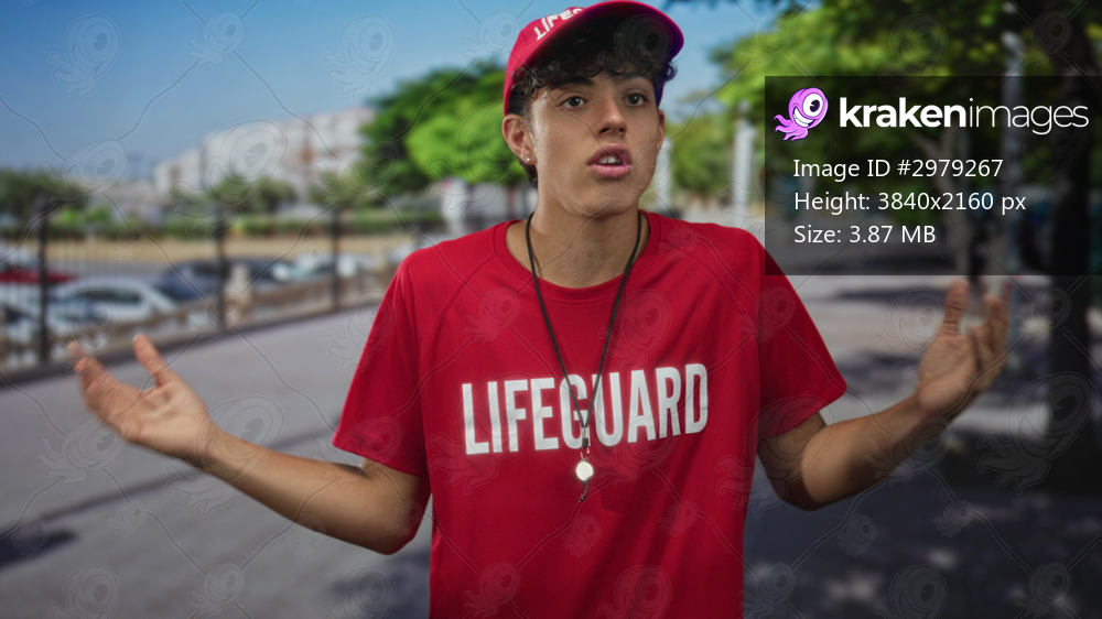Lifeguard teenager in red shirt with whistle gestures with hands on street near trees and parked cars; youthful responsibility.