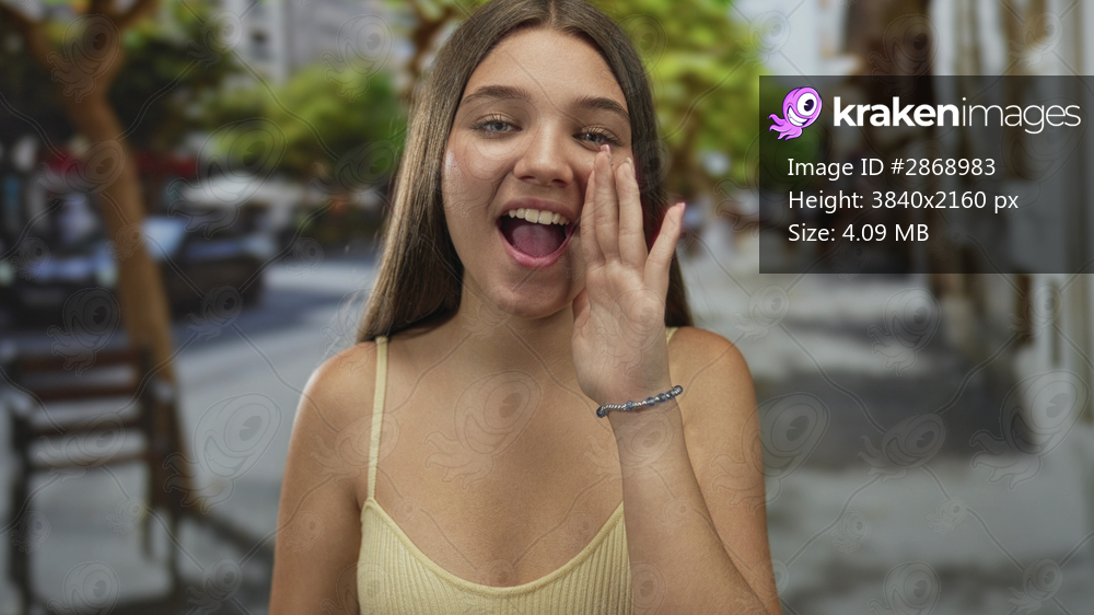 Lively teenage girl with cheerful smile cups hand to mouth while shouting hello on sunlit city street; excitement.