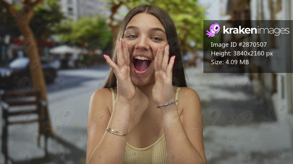 Lively teenage girl with cheerful smile cups hand to mouth while shouting hello on sunlit city street; excitement.