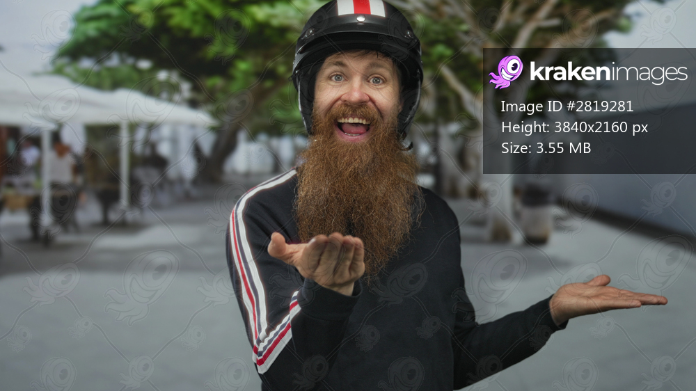 Long bearded man in star helmet holds open palms and smiles on a busy city street under leafy trees; invitation.