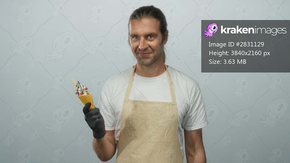 Long hair blond man wearing apron holds icecream cone in black glove in light grey studio setting; anticipation sweetness delight.