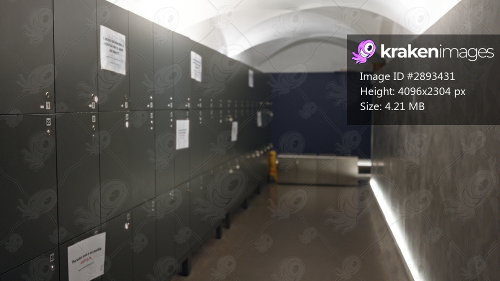Long row of metal lockers captured in soft blurred shallow focus with arched ceiling and reflective floor, corridor; background backplate copyspace.