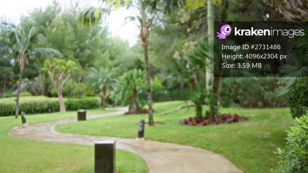 Lush tropical garden with a meandering path in focus, surrounded by vibrant greenery and palm trees, capturing an outdoor luxury resort ambiance with a blurred background. - Kraken Images