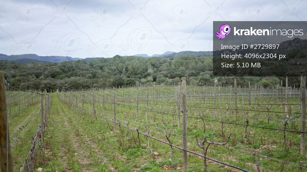 Lush vineyard stretches across green landscape with blurred trees in the background, showcasing mediterranean nature under overcast sky.