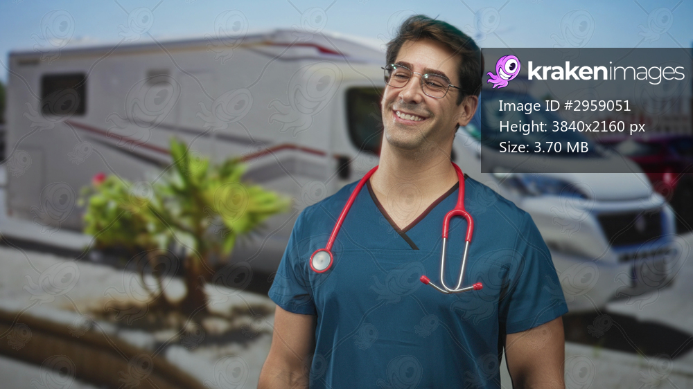 Male doctor in blue scrubs with red stethoscope smiling and tilting head beside parked rv on street; cheerful trust.