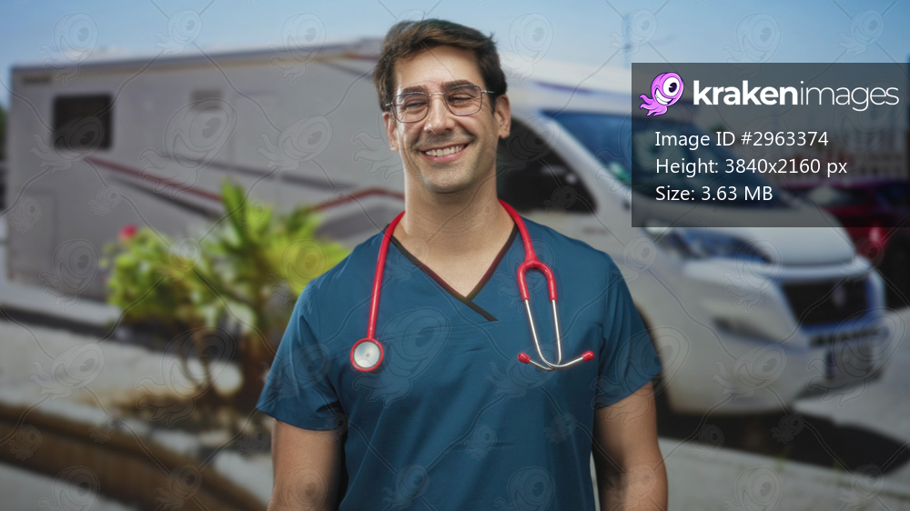 Male doctor in blue scrubs with red stethoscope smiling and tilting head beside parked rv on street; cheerful trust.